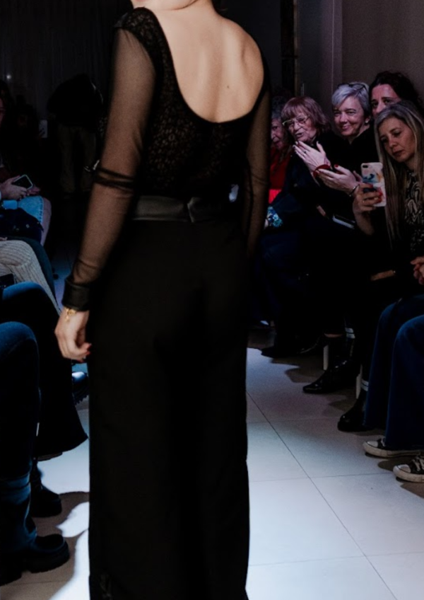 Body confeccionado en encaje semi elastizado, con mangas en microtull y detalles en eco cuero.
