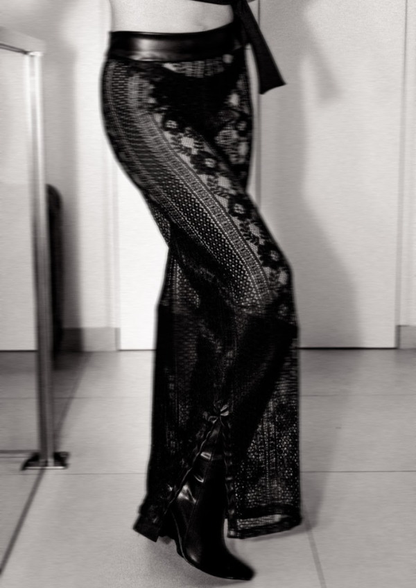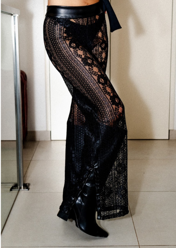 Wide leg confeccionado en encaje, combinado con cintura en eco cuero.
